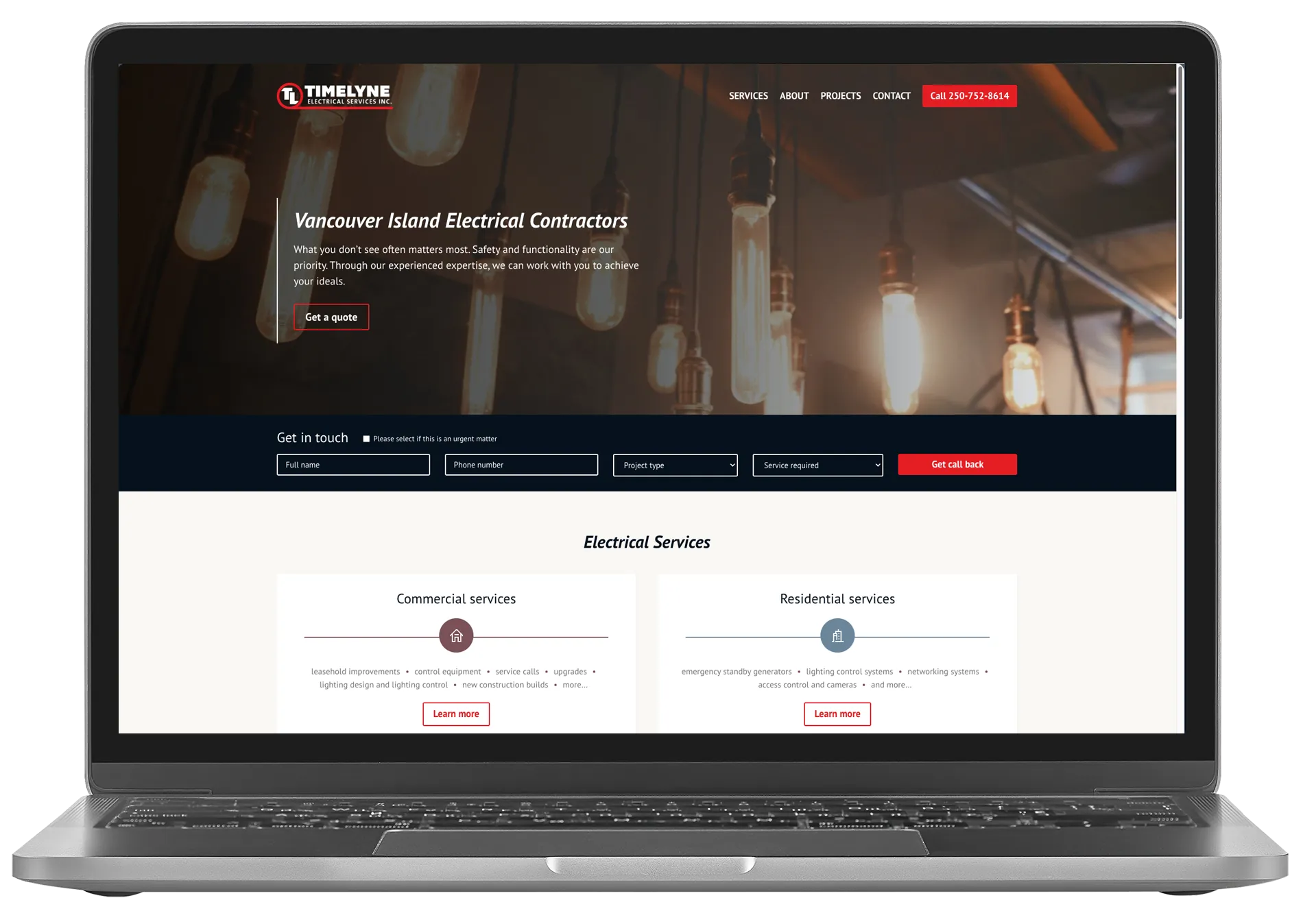 The website includes a structured quote/inquiry workflow with form-based intake (project type, service required, urgency indicator, and contact details), along with an option to request a call back.